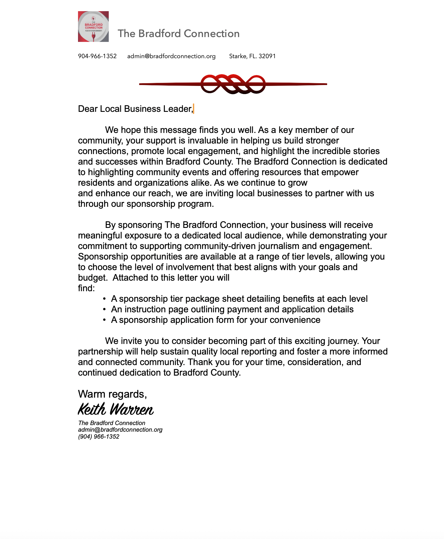 For those interested in sponsoring The Bradford Connection, please download our Sponsorship information below. Instructions for becoming a sponsor are in the Sponsorship Letter. If you have any additional questions, please email me at Admin@BradfordConnection.org