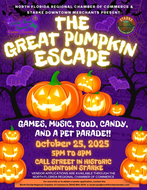 Every year, The Great Pumpkin Escape brings fun, community fellowship, costumes, and CANDY to Call Street in Starke. This year is no different. Mark your calendar to attend October 25, 2025 from 5pm to 8pm. The Great Pumpkin Escape is presented by the North Florida Regional Chamber of Commerce & the Starke Downtown Merchants. This event is FREE to attend. Vendor applications are available through the North Florida Regional Chamber of Commerce by calling (904) 964-5278 or via email at pam@northfloridachamber.com